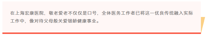 在上海宏康医院有专门收治老年患者的病区,病区配备有专业的医护团队,从病区的设施到服务,处处体现出对老年患者的关爱与呵护。在病房张贴防跌倒防坠床指南以及温馨提示;在病床为患者垫上三角垫减轻压力,防止产生褥疮;在洗手间配备扶手、防滑垫、紧急呼叫器等。和谐的医患场景在这里成为常态,走廊上时常可以看到这样的温馨画面:护士推着轮椅车,陪伴行走不便的老年患者散心。